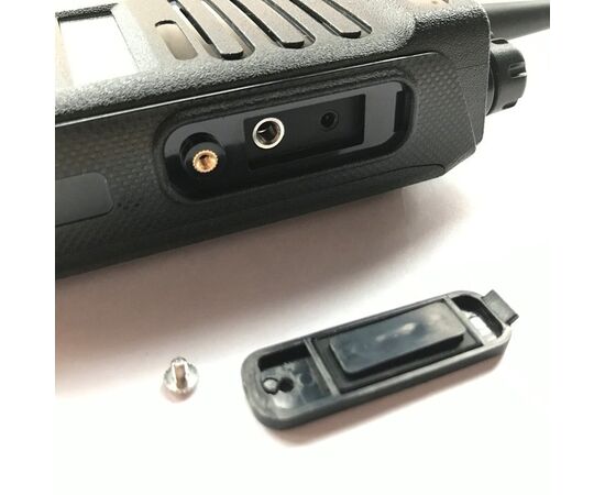 - Разъем для программирования и гарнитуры или тангенты имеет разъема типа Kenwood. Разъем закрывается заглушкой на винте. Заглушка полностью повторяет углубление разъема для максимальной защиты от попадания внутрь влаги или пыли.