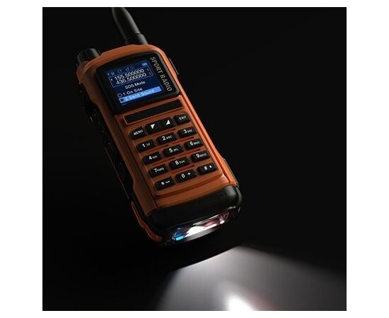 Мощный встроенный фонарь рации Комбат Т-34 Спорт с двумя режимами - свечение и стробоскоп из белого,синего и красного диодов.