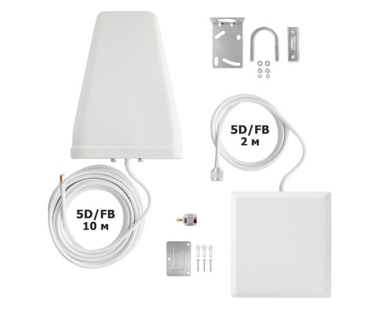 В комплект входит: комнатная антенна, всепогодная антенна, переходник SMA (female) - N (male), крепежи к антеннам.